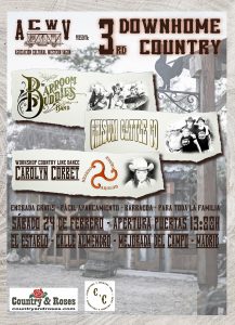 Festival Tercer Downhome Country. En la ACWV (Asociación Cultural Western Vagon) en Mejorada del Campo, Madrid. El emblemático Establo acoge este festival. Dos bandas: The Barroom Buddies Band, y Chisum Cattle Co. Workshop de country line dance por Carolyn Corbet. Y muchas mas actividades.